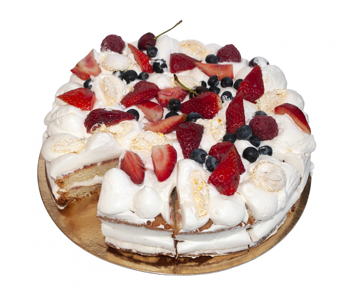 Perinteisesti valmistettua gluteenitonta kakkupohjaa, mansikkahilloa, lemon curdia, vaniljaista kermaa sekä kauden tuoreita marjoja.