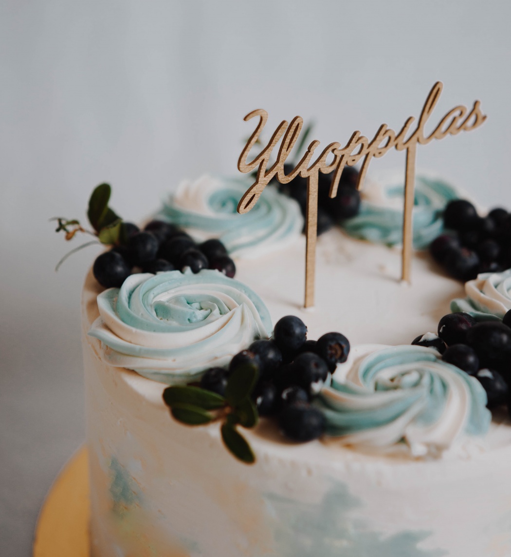 Kakku on laktoositon. Täytteenä on mustikkamousse ja päällä kreemimassaa. koristelu mustikoilla.