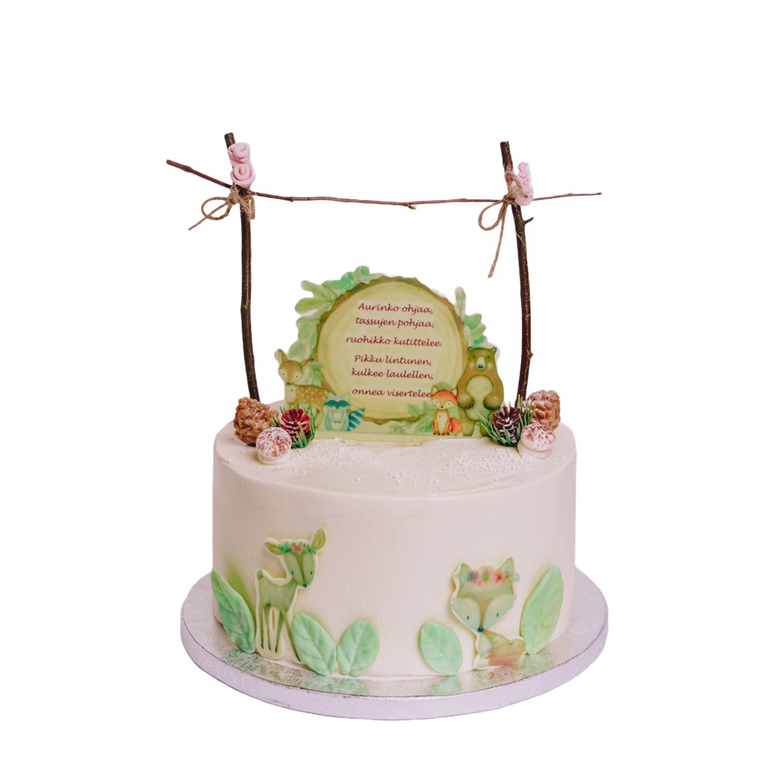 kakussa olevat viidakon eläimet ja kyltti ovat valkosuklaata. Kakun voi saada myös gluteenittomista raaka-aineista valmistettuna.