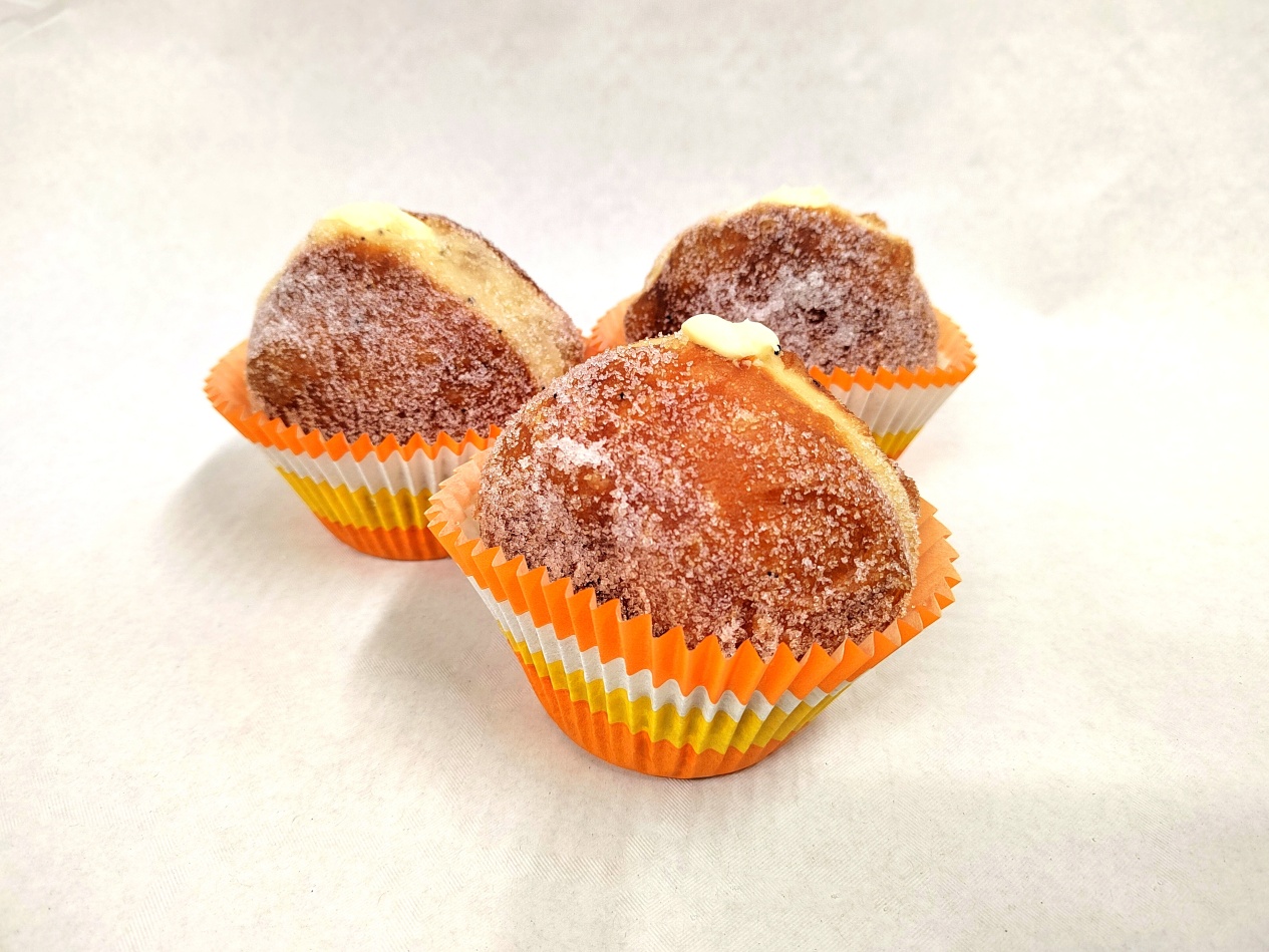 Vaniljakreemitäytteinen munkki. Laktoosittomista raaka-aineista valmistettu.