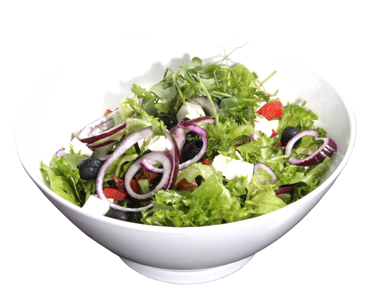 jääsalaatti, rukola, fetajuusto, oliivit, kurkku, kirsikkatomaatti, punasipuli