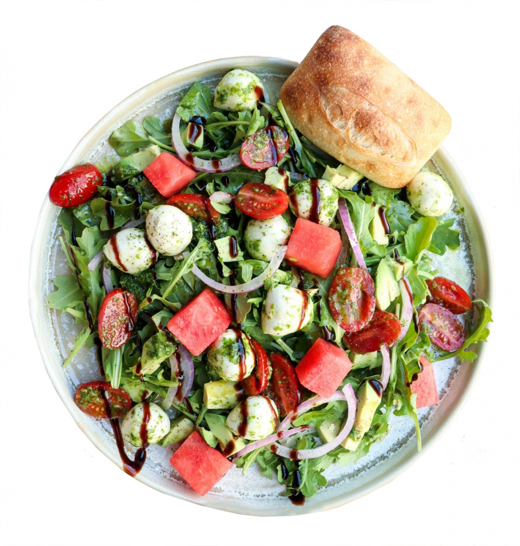 salaatti, kurkku, mozzarella, luumutomaatti, vesimeloni, basilika, kurpitsan siemenet.