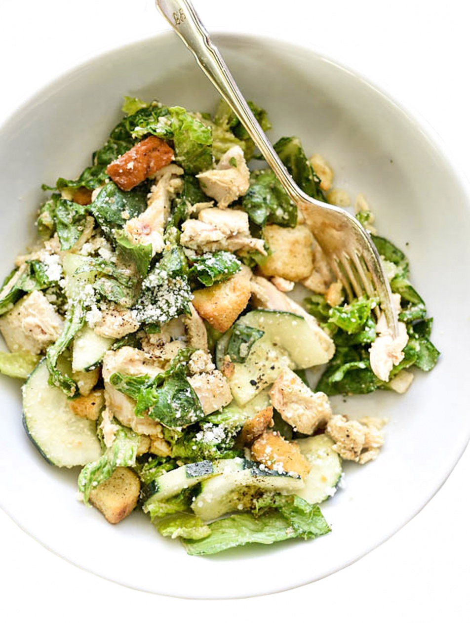 romainesalaattia, broilerinfilettä, parmesanilastuja, prassenin krutonkia (erikseen pyydettynä gluteenittomana)